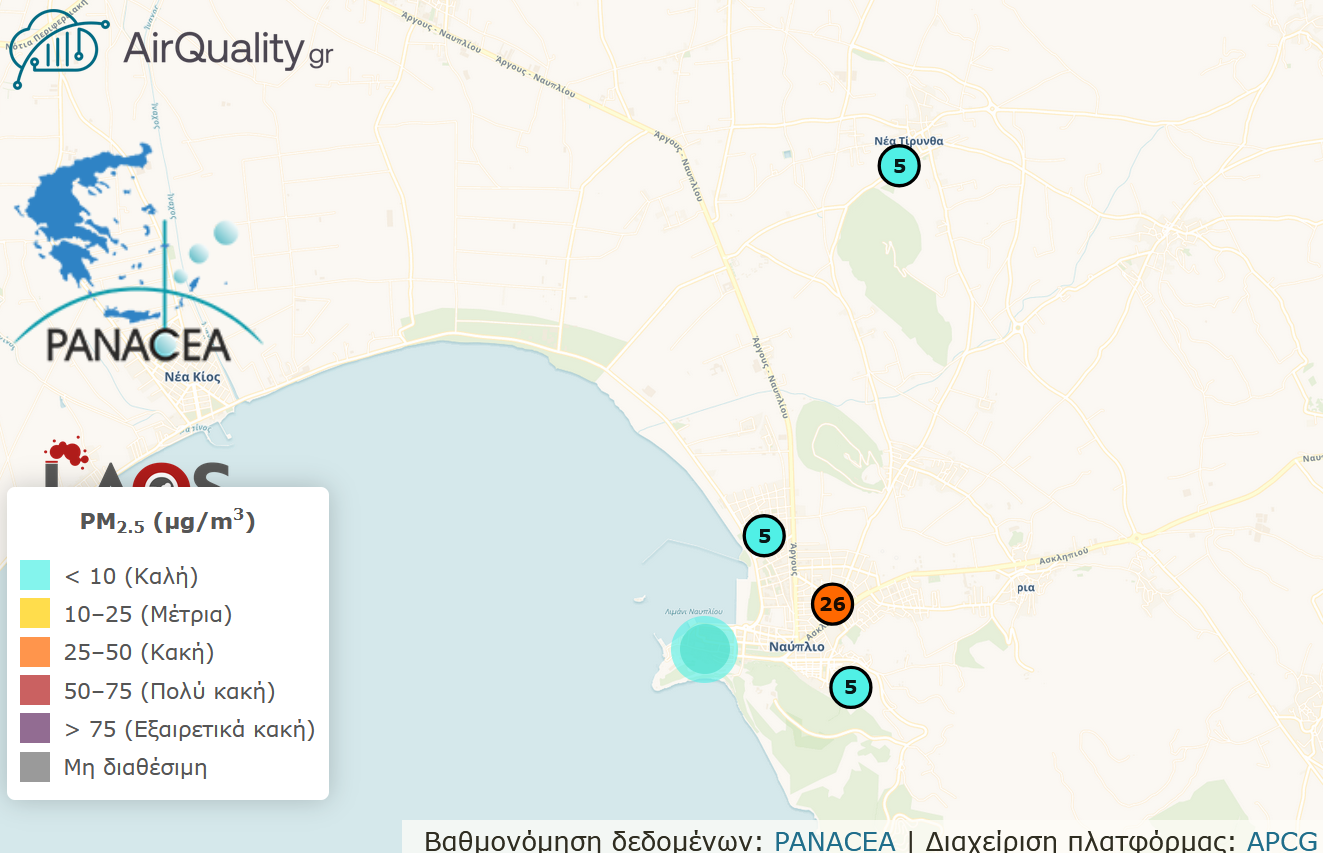 Over the past six months, following the necessary technical preparation and in close collaboration with a local citizen group, a dense network of sensors has been installed in the wider area of Nafplio, Argolis. The network comprises a total of six monitoring sites and enables continuous measurements of fine particulate matter (PM2.5) concentrations.